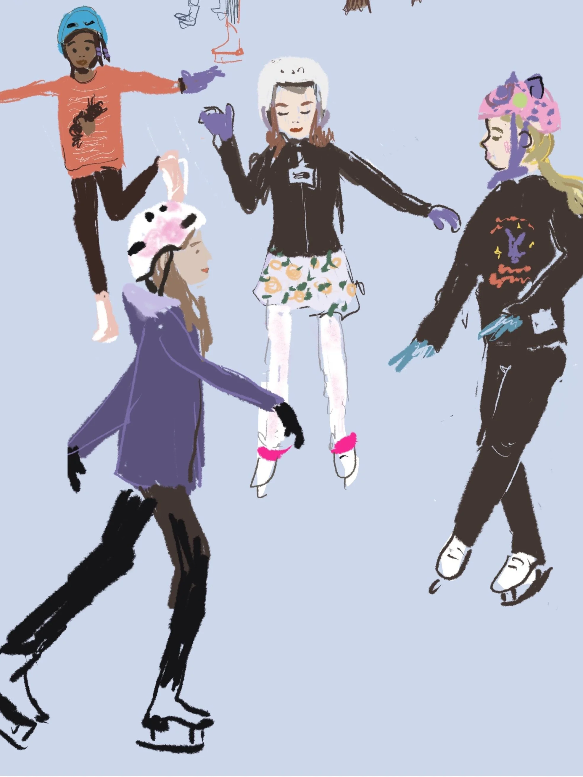 To pass the time, I started making observational sketches during my daughter’s ice skating lessons. I find it very tricky as everyone is in constant motion, small children careen and fall and shoot across the ice like canon balls — but it’s become one of my favorite pastimes.
